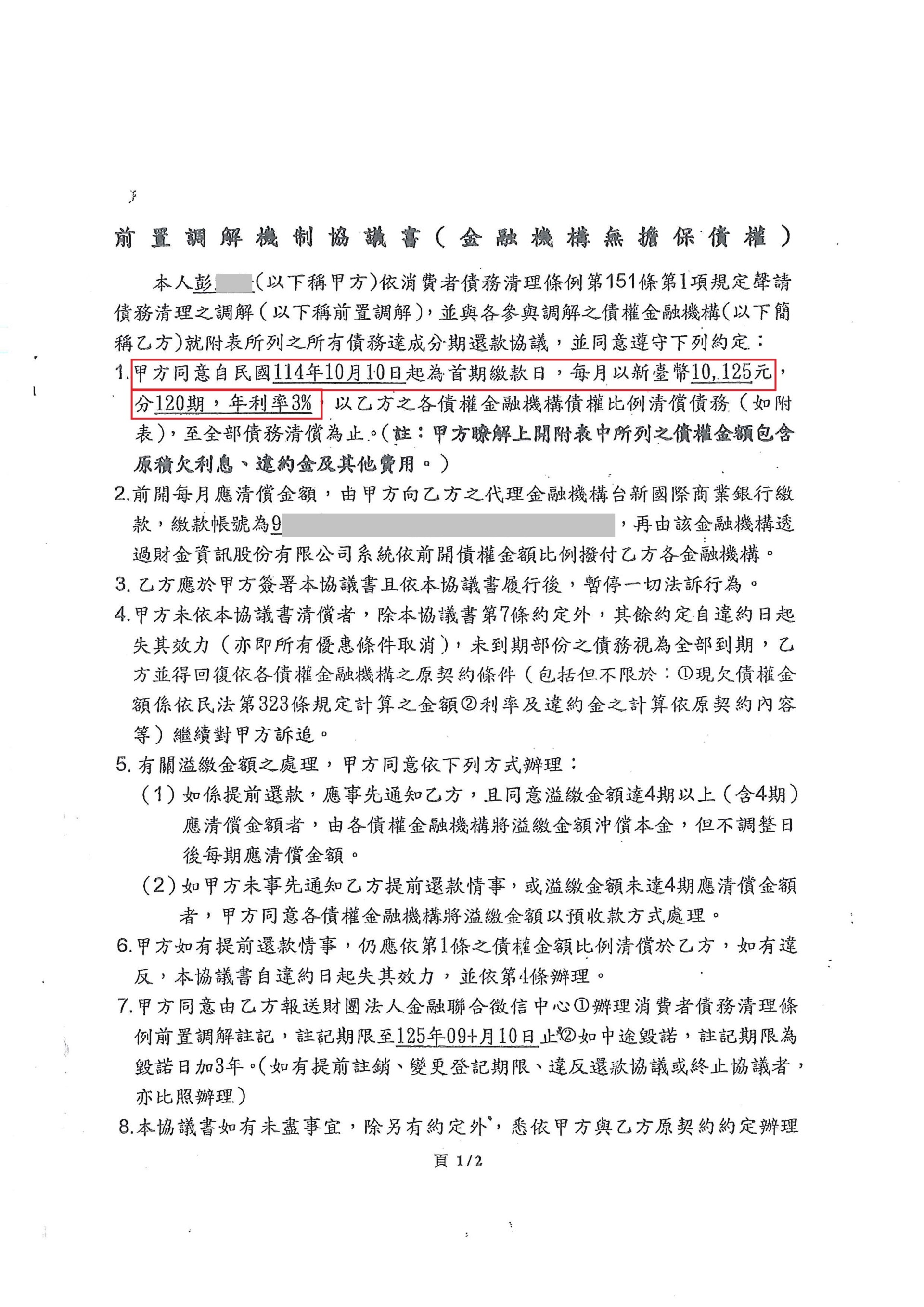 彭小姐因扶養小孩生活開銷大,從原先的小額借貸及卡費也因利息越滾越多,彭小姐為了避免負債持續擴大尋求協會的幫助,與銀行進行「前置調解」,經法院前置調解流程後取得120期3%利率月繳10,125元的清償方案成功解決債務問題,恭喜彭小姐!!!